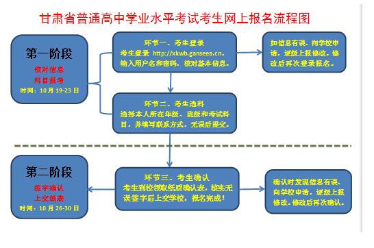 确认时间为10月26至30日,考生在报名学校领取本人《2020年冬季甘肃省普通高中学业水平考试考生报名确认表》,经核实无误签字后上交学校,报名结束。信息确认过程中,如发现信息有误,考生可向学校申请更正,再进行确认。