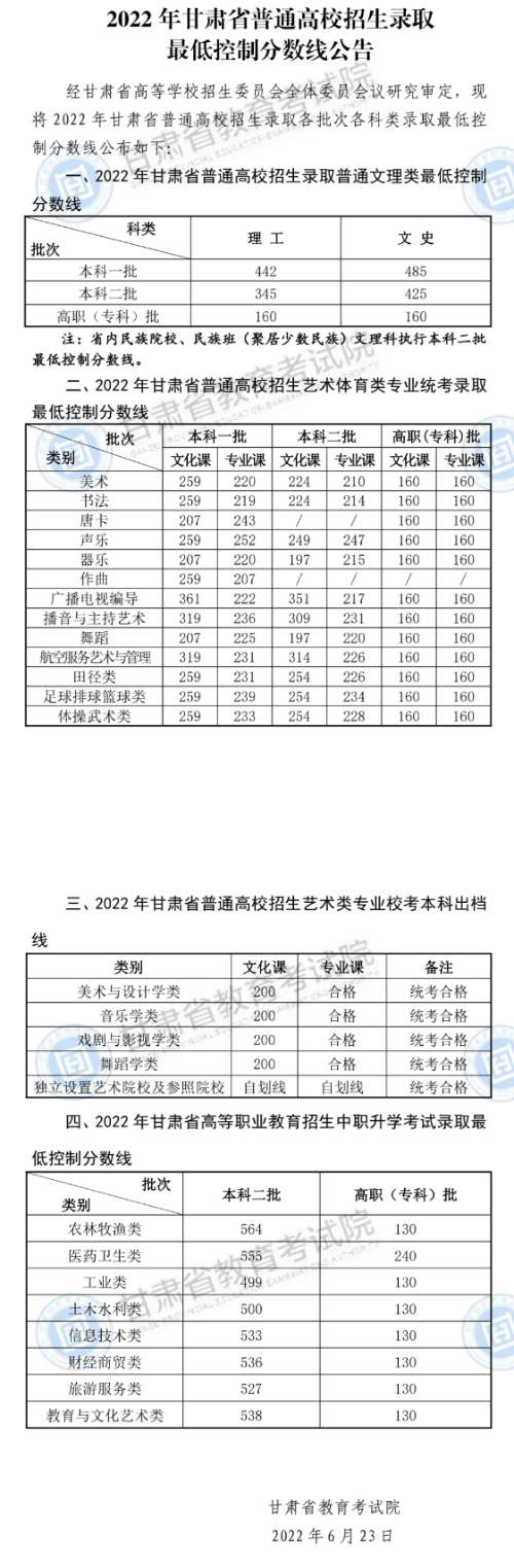 2022年甘肃省普通高校招生录取最低控制分数线公告