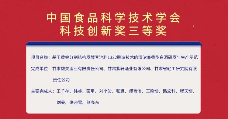 我市“基于黄金分割结构发酵窖池和1322酸造技术的清浓兼香型白酒研发与生产示范”项目荣获三等奖。该项目由甘肃雄关酒业有限责任公司、甘肃紫轩酒业有限公司、甘肃省轻工研究院有限责任公司合作完成。