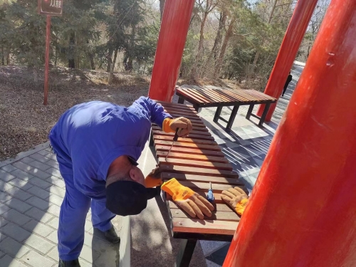 随着天气渐暖,公园人流量明显增多,为推进“三抓三促”行动落到实处,进一步营造美观、大气、干净、整洁的游园环境。近日,迎宾湖园区管理处从细微处着手,按照“常观察、勤检修、精管理”的理念,全面启动公园基础设施维修工作,给市民提供一个优美、舒适、安全、绿色的休闲环境。