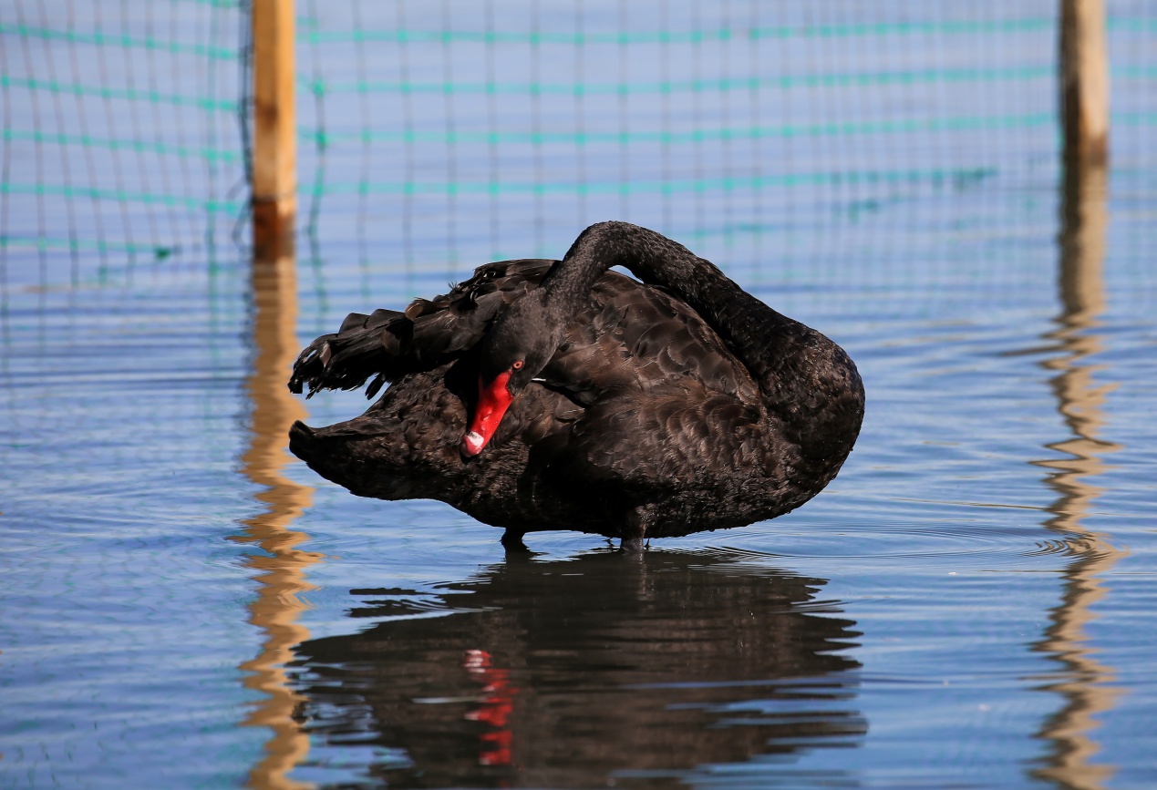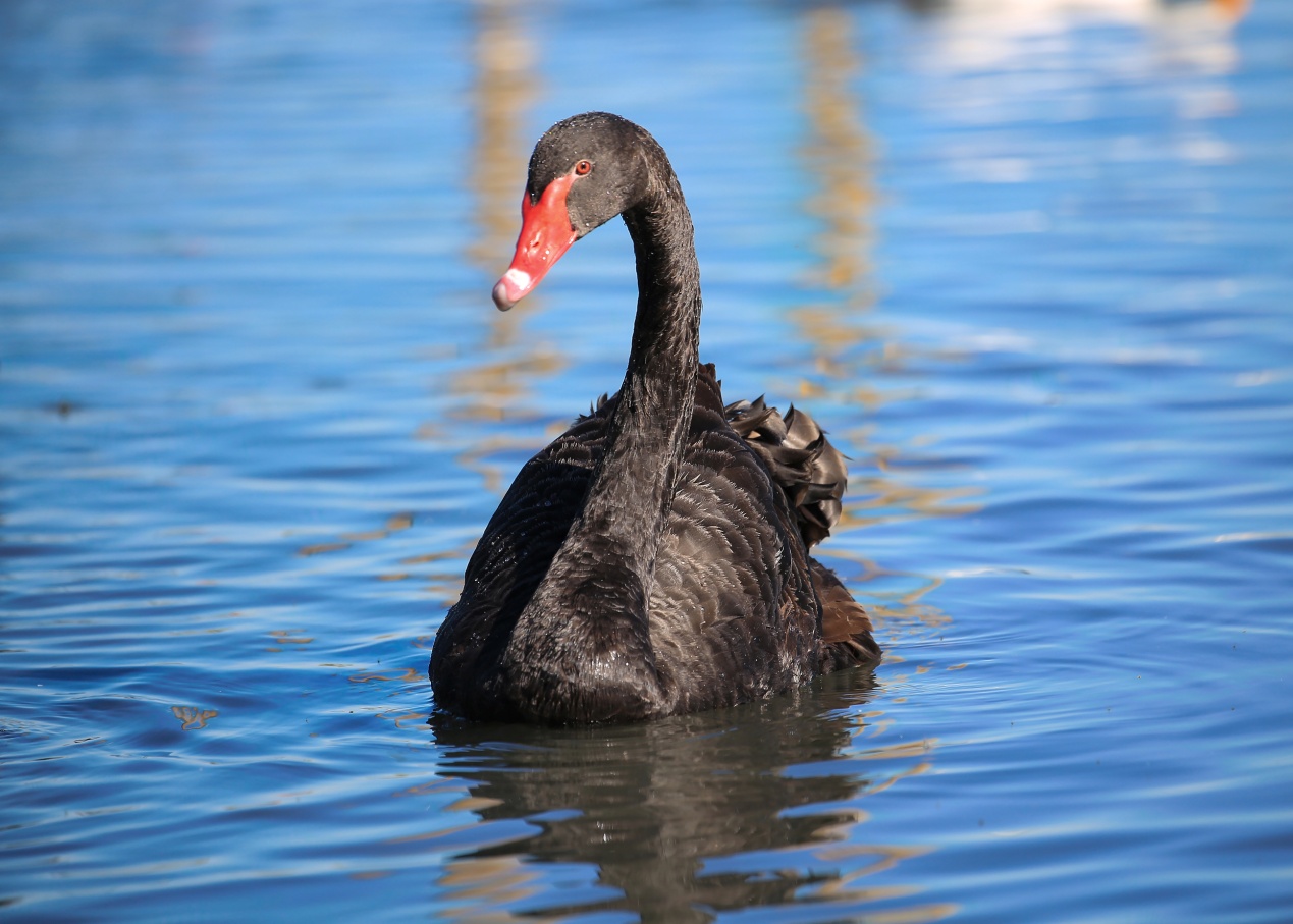 黑天鹅(学名:Cygnus atratus)是鸭科天鹅属的一种大型游禽,体长110-140厘米;翼展160-200厘米,体重3.7-8.75千克,具有天鹅种类中长的脖子。这个细长的脖子通常呈“S”形拱起或直立,全身羽毛卷曲,体羽斑点闪烁,主要呈黑灰色或黑褐色,腹部为灰白色,飞羽为白色,尾长而分叉,外侧羽端钝而上翘形似竖琴。有一个明亮的蜡质的鸟喙,为红色或橘红色,靠近端部有一条白色横纹。虹膜为红色或白色,跗跖和蹼为黑色。