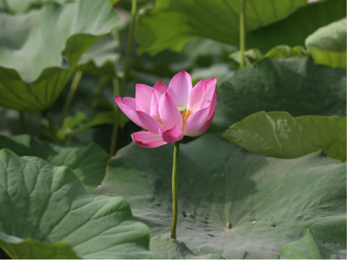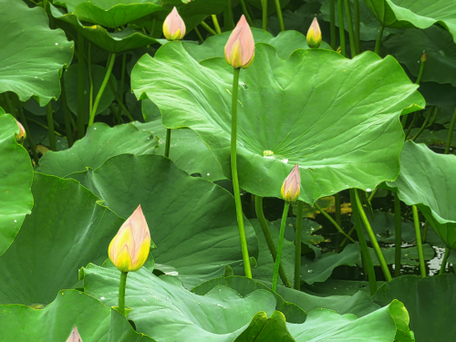 初到迎宾湖,那大片的荷叶便映入眼帘。它们挨挨挤挤,像一个个碧绿的大圆盘,又似一把把撑开的绿伞。晨光初露,水面下的藕节正积蓄能量。那些深埋淤泥的嫩芽,带着对光明的渴望,小心翼翼地探出水面。最初的花苞,像一支支裹着绿纱的毛笔,感受着世界的温度。