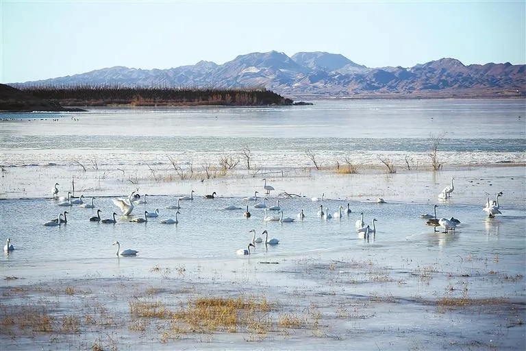 民勤县红崖山水库良好的生态环境引来天鹅栖息。新甘肃·甘肃日报通讯员 姜爱平
