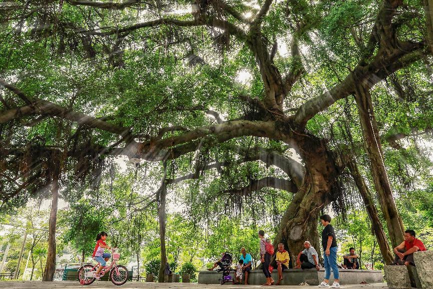 广东省白云区钟落潭镇居民在古榕树下纳凉(石建华 摄)