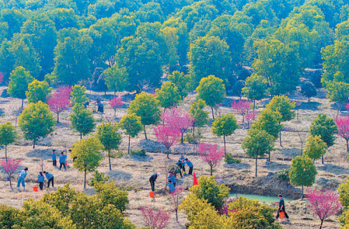 3月11日,在浙江省湖州市长兴县夹浦镇滨湖村,小学师生和志愿者一起植树添绿。 新华社发