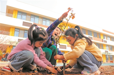 3月12日,小朋友在山东潍坊高密市凤鸣幼儿园校园内栽种小树苗。新华社发