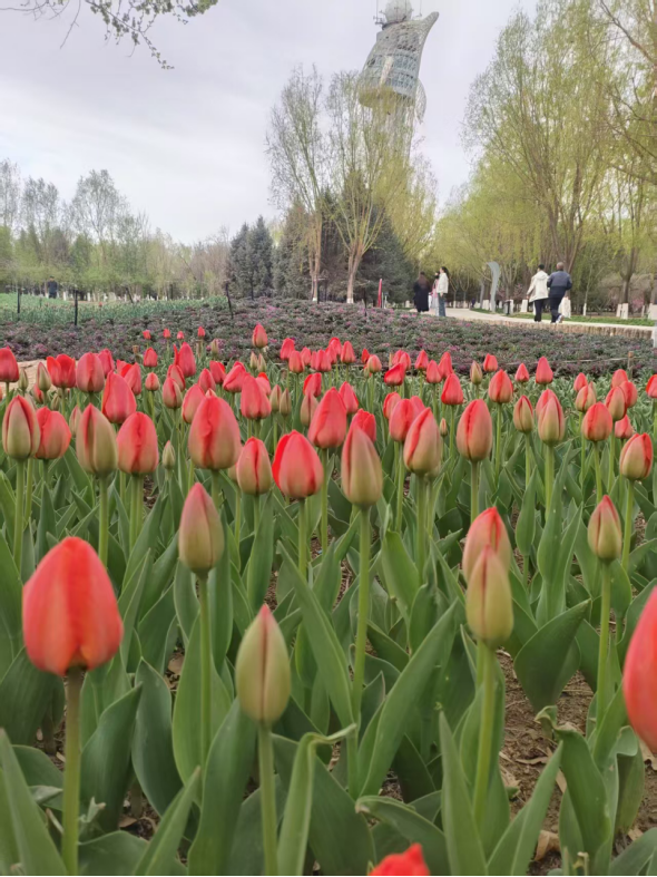 作为荷兰国花的郁金香,因其典雅花型与缤纷色彩被誉为“花中皇后”。它不仅是春日浪漫的象征,更承载着丝路文化交流的印记。东湖景区精选10大品类6种色系的郁金香(如经典红“帝王血”、梦幻紫“夜皇后”、渐变“鹦鹉系列”橙色、红色、粉色、黄色、重瓣、紫色等),以不同色系交织成大地调色盘,为戈壁明珠增添一抹异域风情。