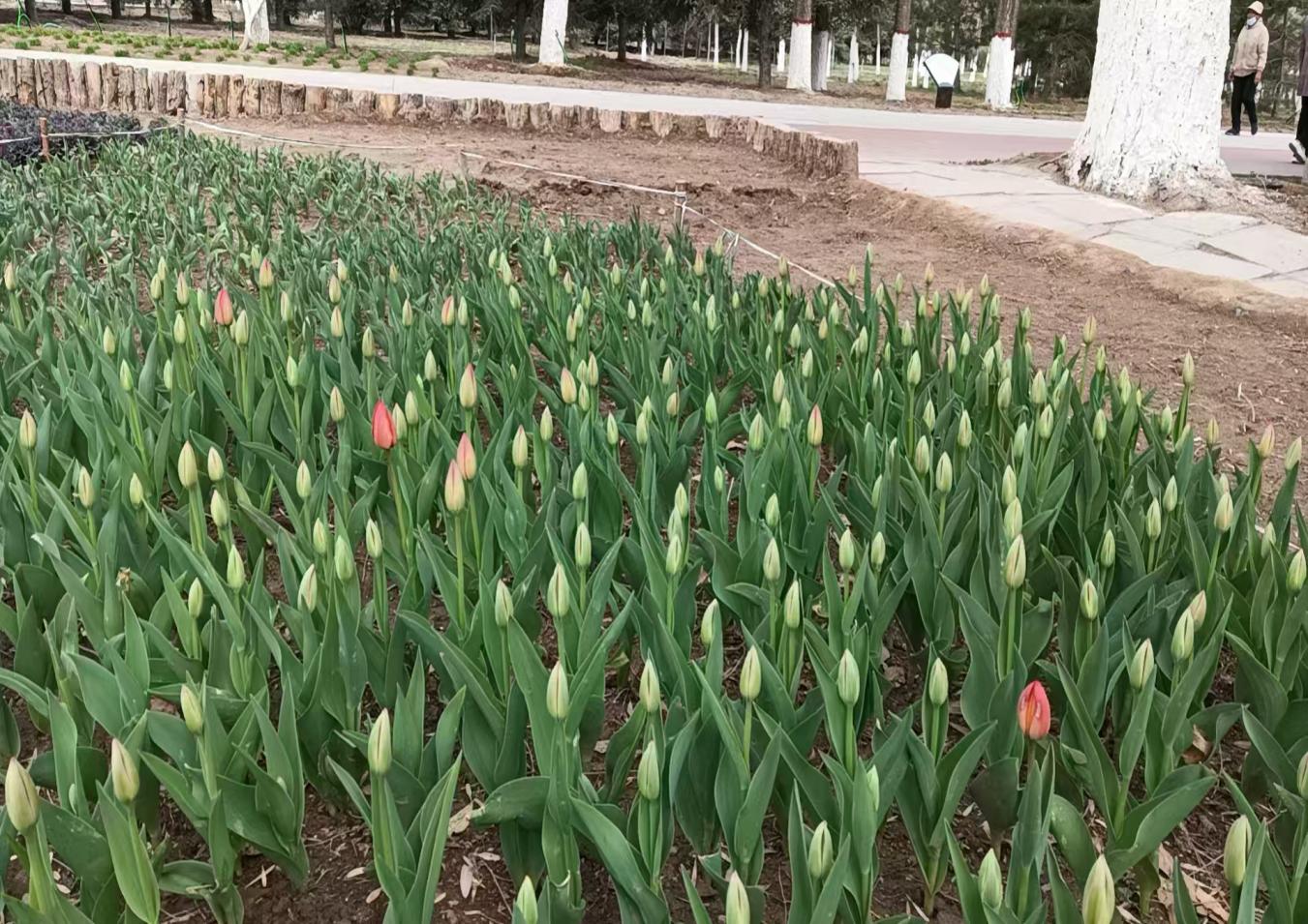 为进一步丰富景区花卉品种,提高植物多样性。2024年11月,东湖生态旅游景区开展郁金香种植项目,通过引进优质种球、精心规划种植图形与微地形造景,同步对种植区域的土壤进行改良。针对土壤僵硬板结、透气性不足的问题,工作人员精准掺入有机肥、沙土优化结构,成功打造出适宜郁金香种球萌发的理想“温床”。工作人员以8-10厘米深度、15厘米间距精准栽种3万余株种球。今年早春,景区对郁金香实施全周期管护,利用滴灌系统精准补水,追施磷钾肥强化花茎生长,人工除草保障养分供给,并运用生物防治技术防控病害。