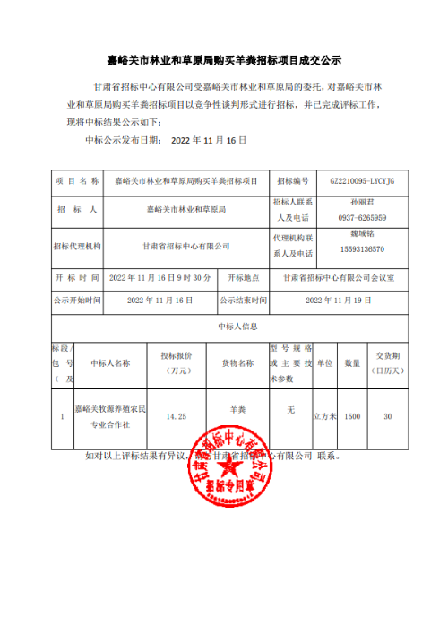 嘉峪关市林业和草原局购买羊粪招标项目成交公示