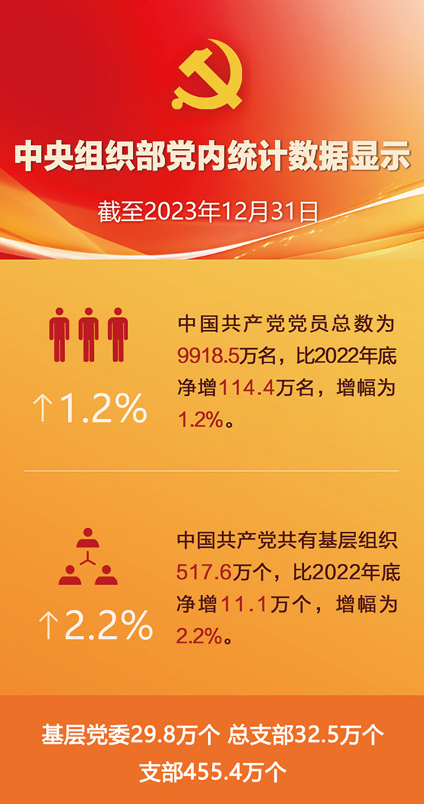中央组织部2024年6月党内统计数据显示:截至2023年底,中国共产党党员总数为9918.5万名,比上年净增114.4万名。党的基层组织517.6万个,比上年净增11.1万个。中国共产党坚持大抓基层的鲜明导向,持续强基固本、补齐短板弱项,不断严密上下贯通、执行有力的组织体系,全面加强党员队伍建设,充分发挥基层党组织战斗堡垒作用和党员先锋模范作用,使党始终保持旺盛生命力和强大战斗力。