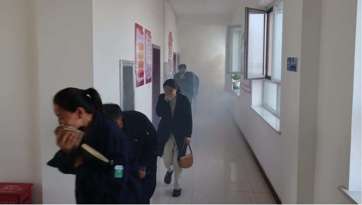 随后,应急疏散演练正式开始。随着警示声响起,全体参会人员迅速用湿毛巾捂住口鼻,弯腰低姿,按照预定的疏散路线有序撤离至安全地带。整个过程中,参与人员行动迅速、配合默契,展现了良好的应急反应能力和团队协作精神。