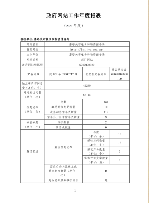嘉峪关市粮食和物资储备局2020年政府网站工作年度报表