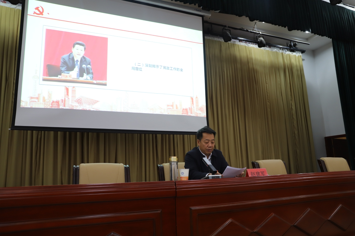 赵建军强调,一要把握根本遵循,砥砺奋进保民生。民政工作是中国特色社会主义事业的重要组成部分,是治国安邦的重要工作,体现党的性质宗旨,展现社会主义制度的优越性。“民政工作关系民生、连着民心”是习近平总书记对民政工作政治属性的生动阐述,全局党员干部要坚持人民至上、坚持共同富裕,把增进民生福祉、提升人民生活品质作为一切工作的出发点和落脚点,使改革发展成果更多更公平惠及群众。二要落实根本要求,全心全意惠民生。要坚决贯彻以人民为中心的发展思想,发挥好民政工作在社会建设中的兜底性、基础性作用,履行好基本民生保障、基层社会治理、基本社会服务职能。民政工作中既有以全民为对象的工作,又有以一部分人为对象的工作,但总体来看,民政工作是以群众为服务对象的。新征程上,全局上下要更加自觉地从为民赢得民心、巩固党的执政地位出发,密切联系群众,把保障民政对象的基本权益作为首要任务,落实社会救助、社会福利政策,精准保障好困难群众、特困人员、孤儿、事实无人抚养儿童、生活困难和重度残疾人、生活无着流浪乞讨人员、特殊困难精神障碍人员、因疫因灾临时遇困人员等群体基本生活,发挥慈善第三次分配作用,把群众的关切作为工作的“晴雨表”、处处用民心这把“尺子”检验民政工作成效。三要坚持以学铸魂,争先进位促发展。要以学铸魂固根本、融合贯通强能力、知行合一促发展,用好各种学习机会加强理论学习,接受思想洗礼,提升政治觉悟,不断掌握习近平总书记关于民政工作的重要指示批示精神蕴含的马克思主义立场观点方法和道理学理哲理情理,将学习过程和成果贯彻到工作思路、目标、任务的确定上,着力在提高思维能力上下功夫、在破解发展难题上用全力、在勇于担当作为上见实效,做到学思用贯通、知信行统一。