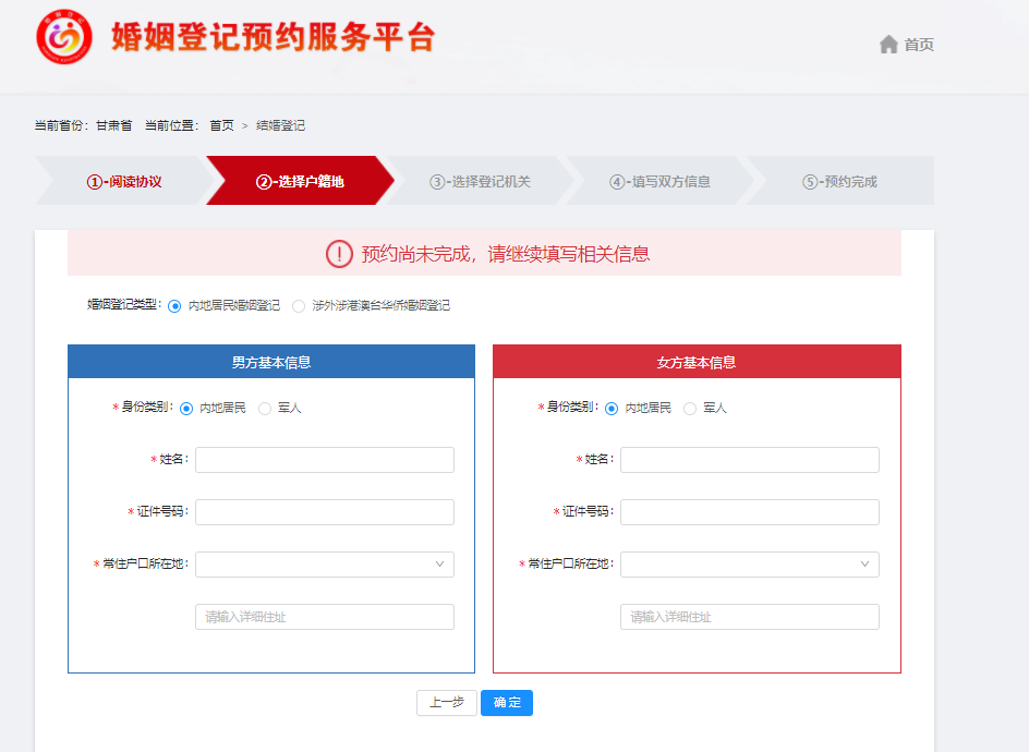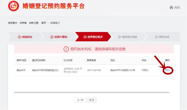 1.当事人登录“婚姻登记预约服务平台(https://hygl.mca.gov.cn/#/),选择户口所在省份“甘肃省”