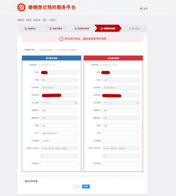 一、需要申请办理婚姻登记且一方户籍地为嘉峪关市的当事人,可通过登录“https://hygl.mca.gov.cn/#/”进行网上预约(文后附网上预约流程图);不便于在网上预约的当事人,可通过拨打电话(0937-6287406)进行婚姻登记业务预约,婚姻登记处安排专人在正常办公时间接听咨询、预约电话,并为当事人提供详细、专业的解答,婚姻登记处根据每个当事人的具体实际情况告知当事人婚姻登记时所需的证件材料。当事人于登记日前的任一工作日持所需的证件材料前往市民政局婚姻登记处进行现场预审证件预约登记。