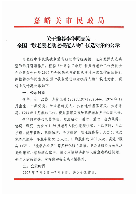 关于推荐李华同志为全国“敬老爱老助老模范人物”候选对象的公示