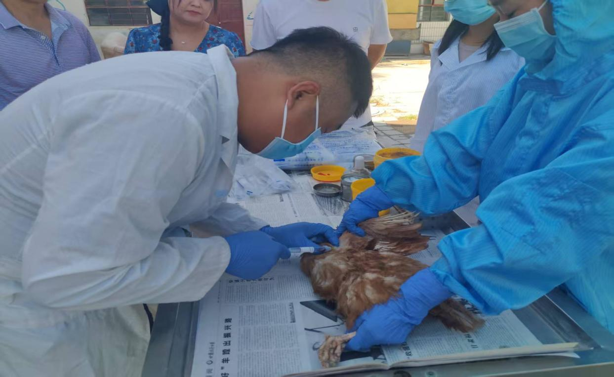 本次主题党日活动,采取现场教学方式,针对动物疫病防治员业务技能进行岗位培训,内容主要有鸡翅静脉采血、鸡心脏采血、鸡体解剖与采样三个部分,大家轮流操作,相互交流分享经验,达到了理论和实践结合、演练和实战接轨、比赛和练兵同步的目的,也激发了党员干部学理论、强技能、钻业务、促落实的积极性和主动性。