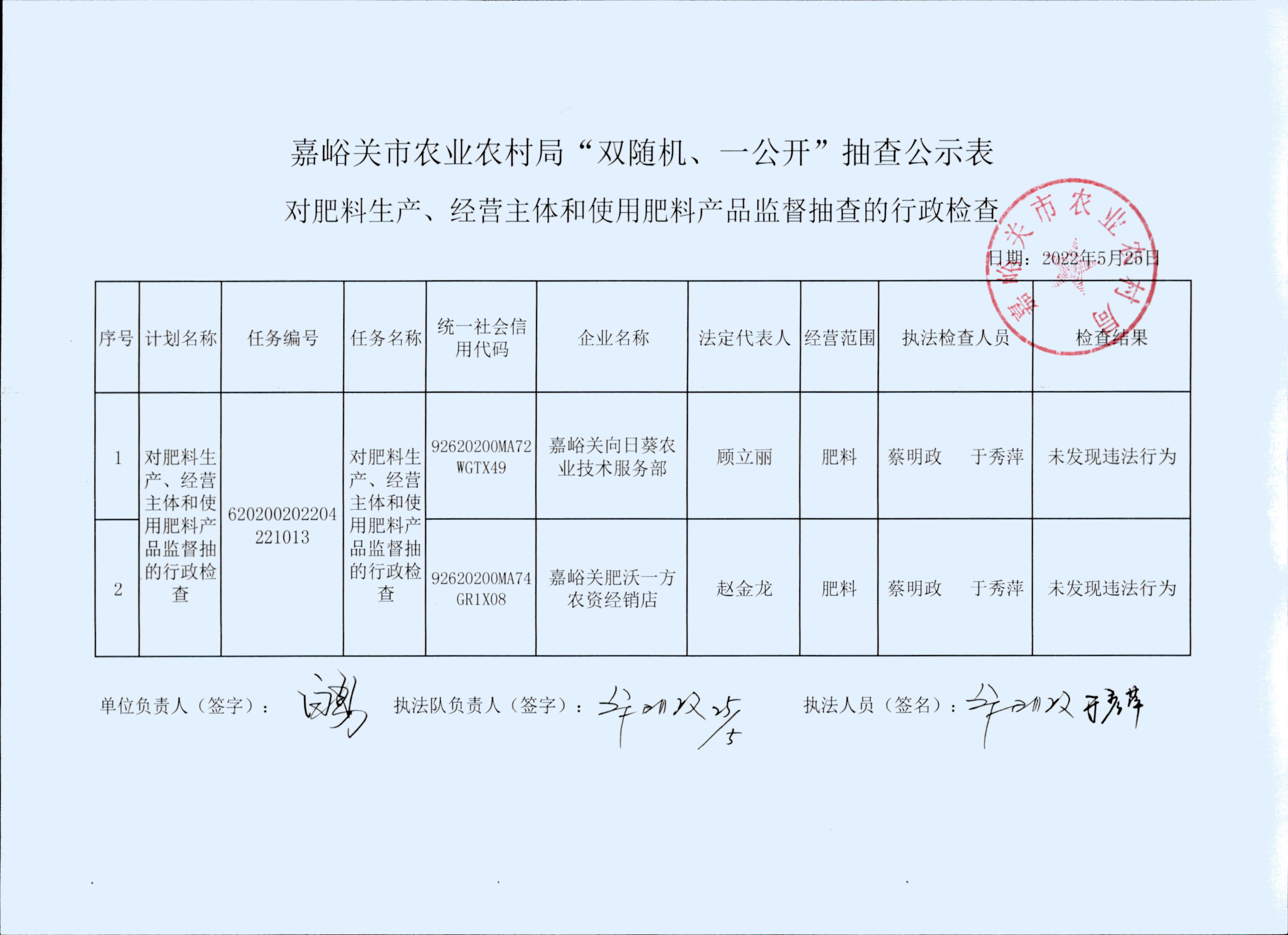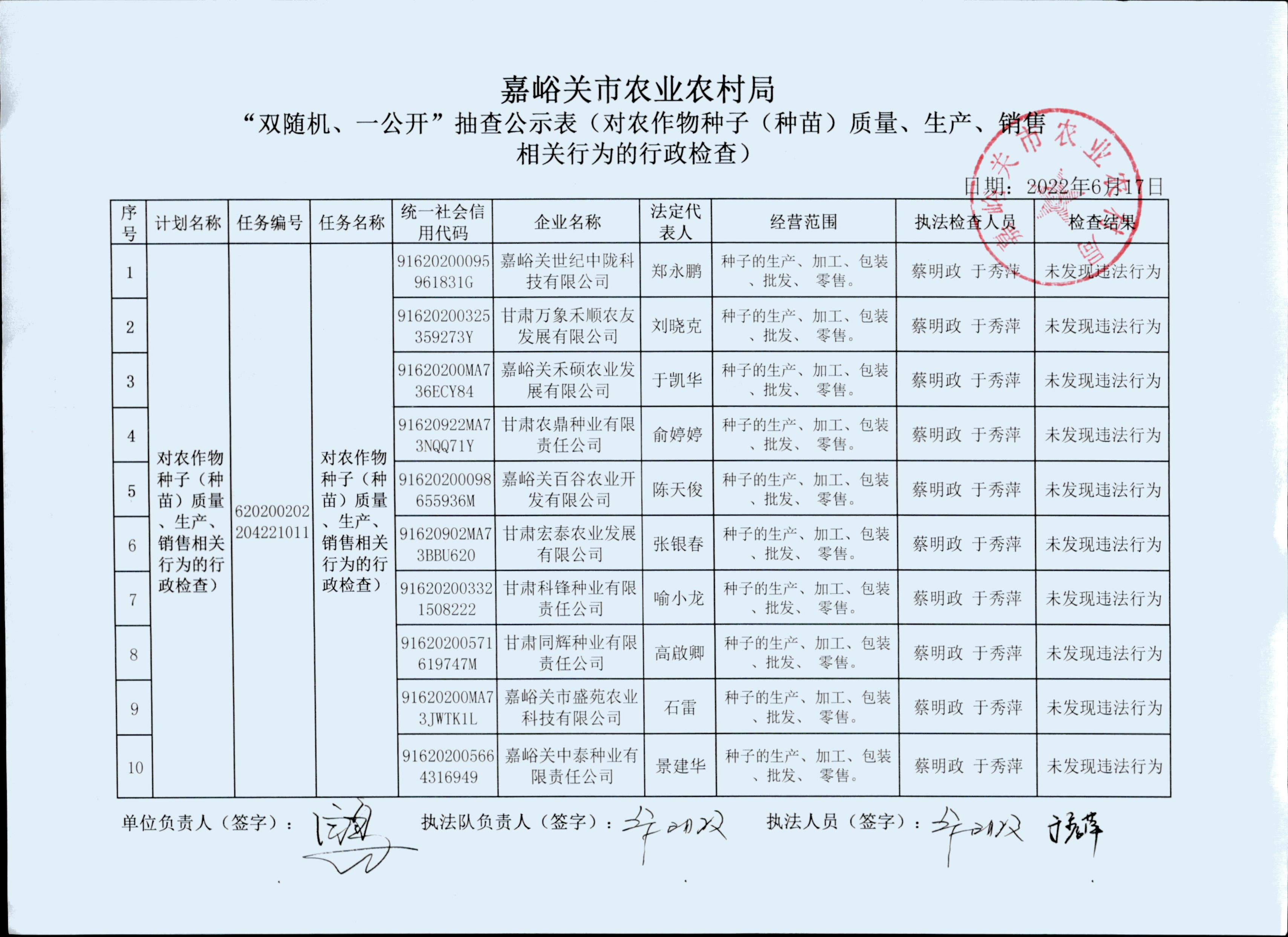 嘉峪关市农业农村局“双随机、一公开”抽查公示表