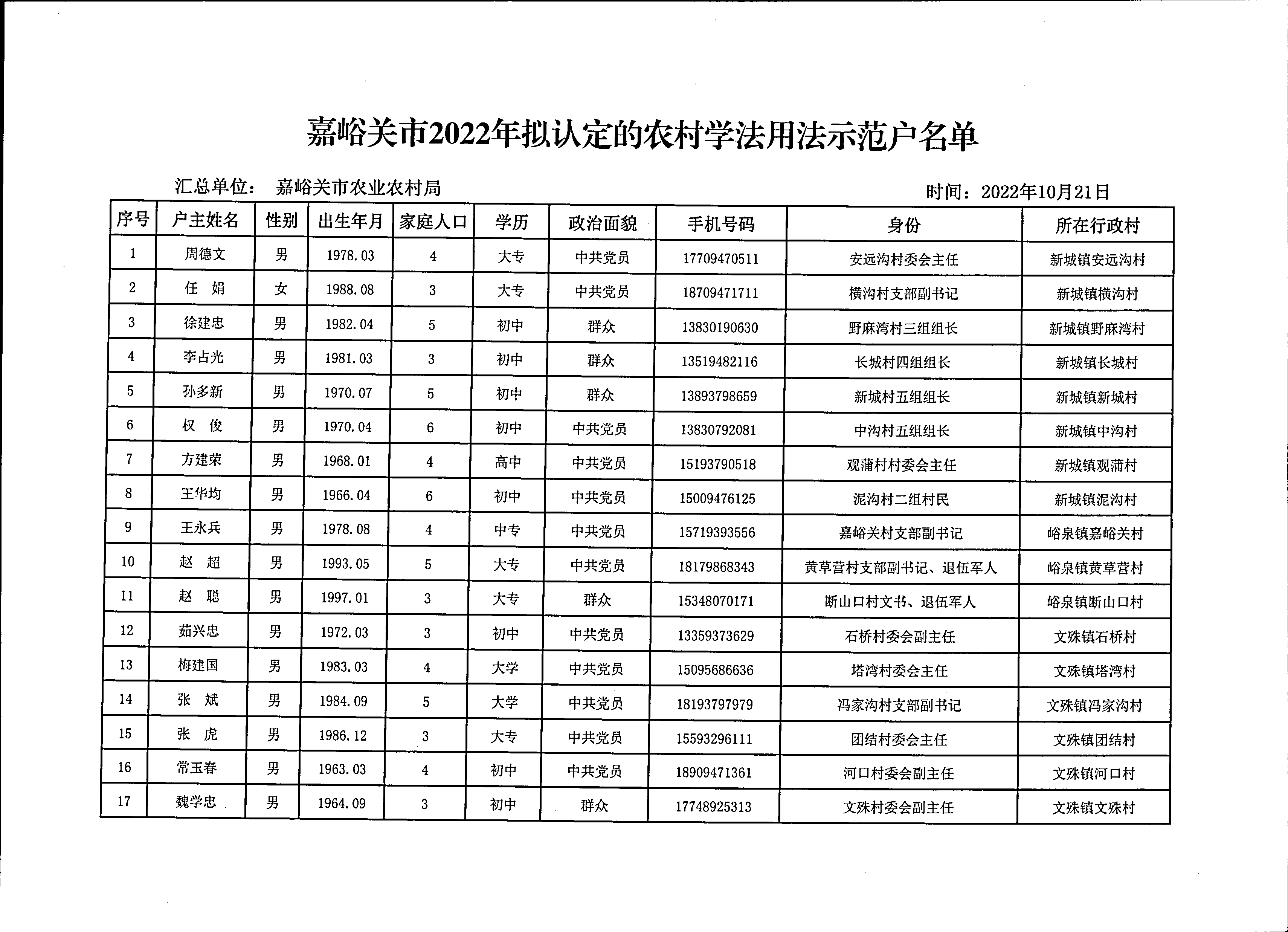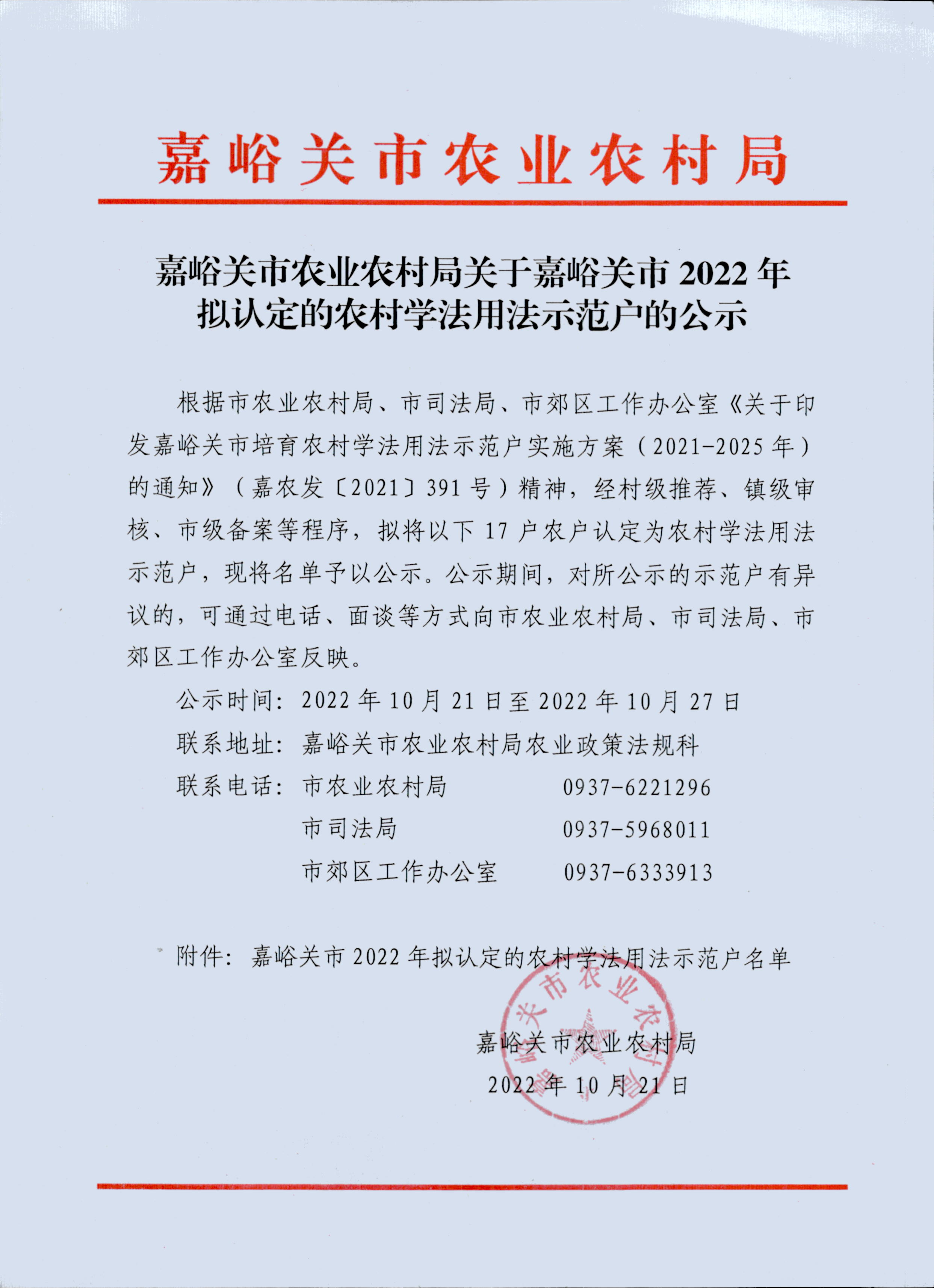 嘉峪关市农业农村局关于嘉峪关市2022年拟认定的农村学法用法示范户的公示
