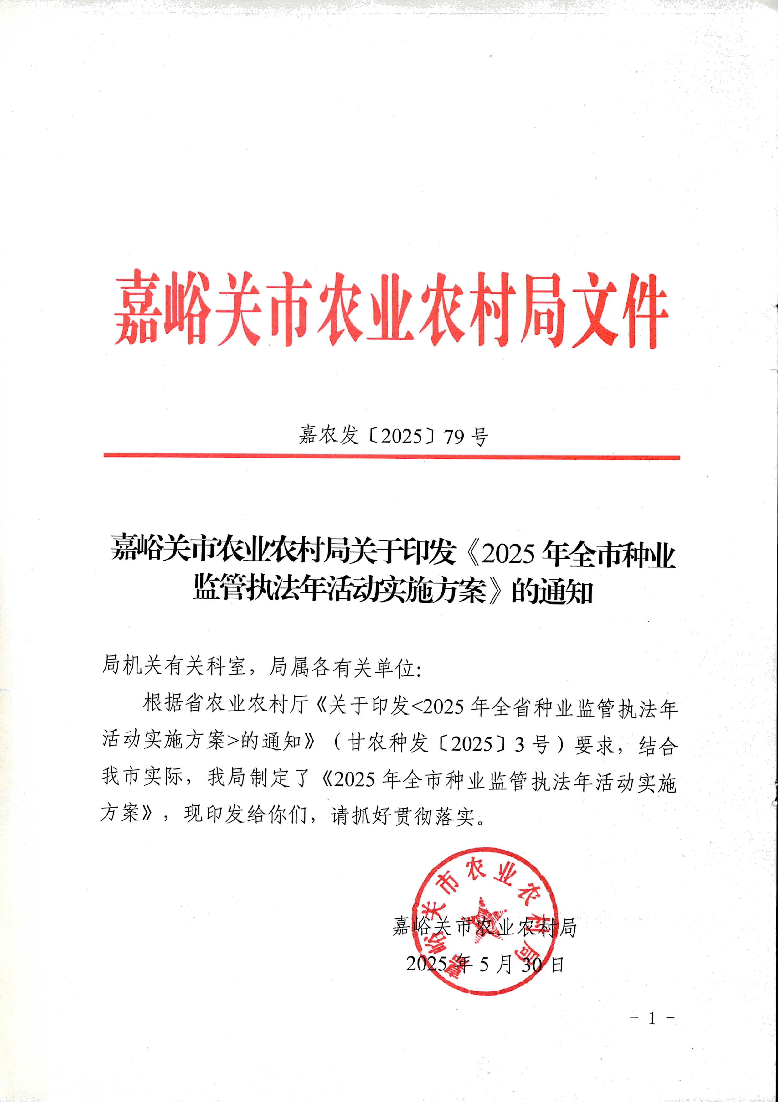 嘉峪关市农业农村局关于印发《2025年全市种业监管执法年活动实施方案》的通知