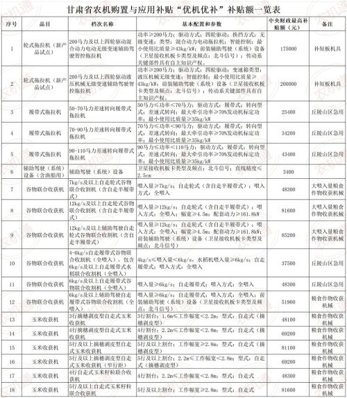 甘肃省农业农村厅关于甘肃省农机购置与应用补贴“优机优补”补贴额一览表的公告