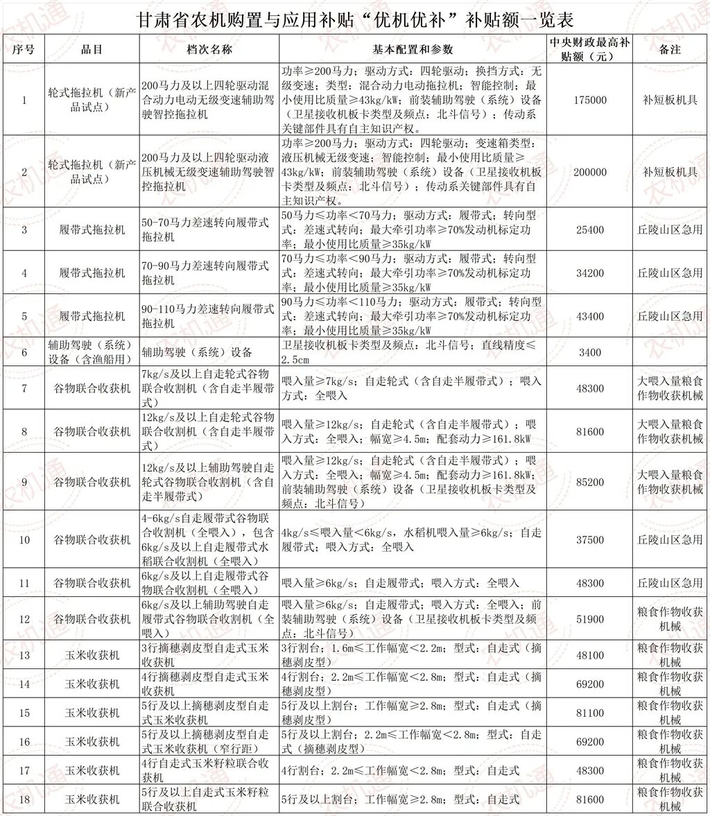 最高补贴20万元!甘肃省农机购置与应用补贴“优机优补”补贴额一览表公告!