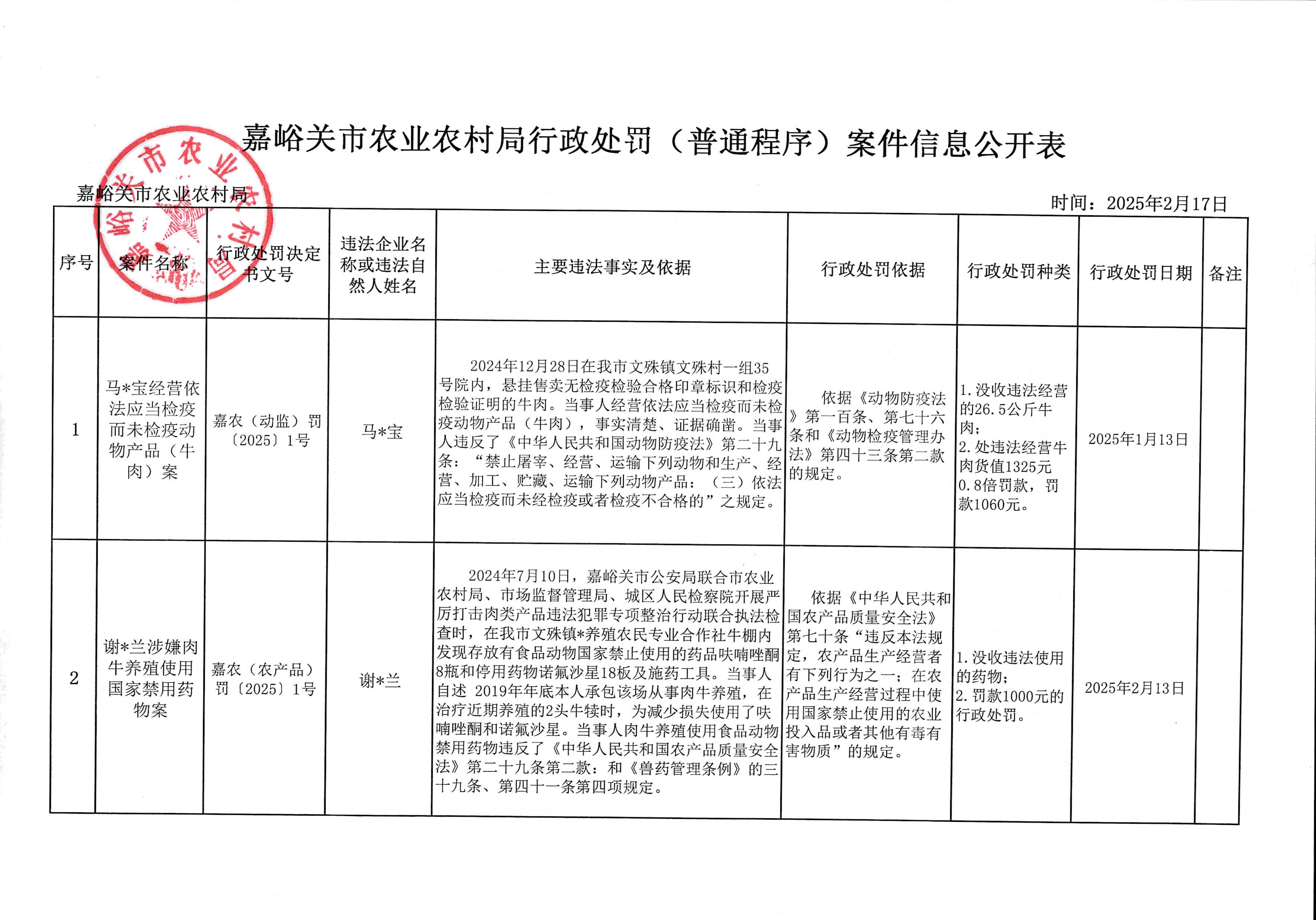 嘉峪关市农业农村局行政处罚(普通程序)案件信息公开表