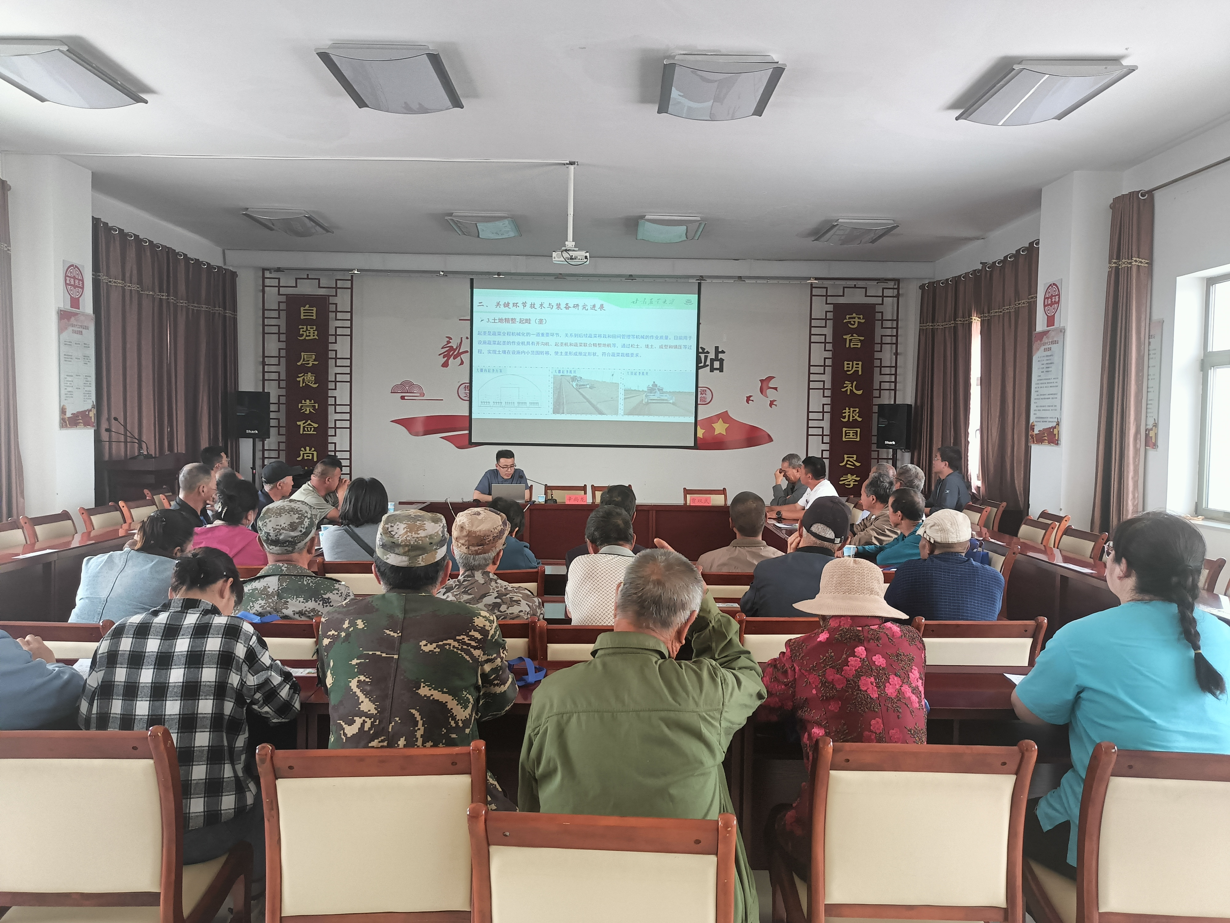 结合这次农机装备现场观摩演示活动举办,当天,在团结村委会举办蔬菜及设施种植机械化技术培训讲座,邀请省农机化技术推广总站正高级工程师赵海志同志、甘农大机电工程学院博士、高校讲师辛尚龙同志分别就蔬菜生产全程机械化关键环节技术、设施农业机械化发展现状、趋势及政策进行了培训讲授。文殊镇团结村组织当地农民群众32人参加了培训讲座。