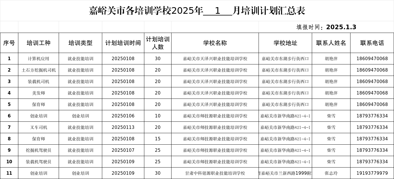 附件:嘉峪关市各培训学校2025年1月培训计划汇总表
