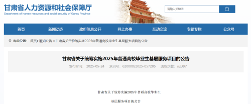 5月24日,甘肃省发布《关于统筹实施2025年普通高校毕业生基层服务项目的公告》。