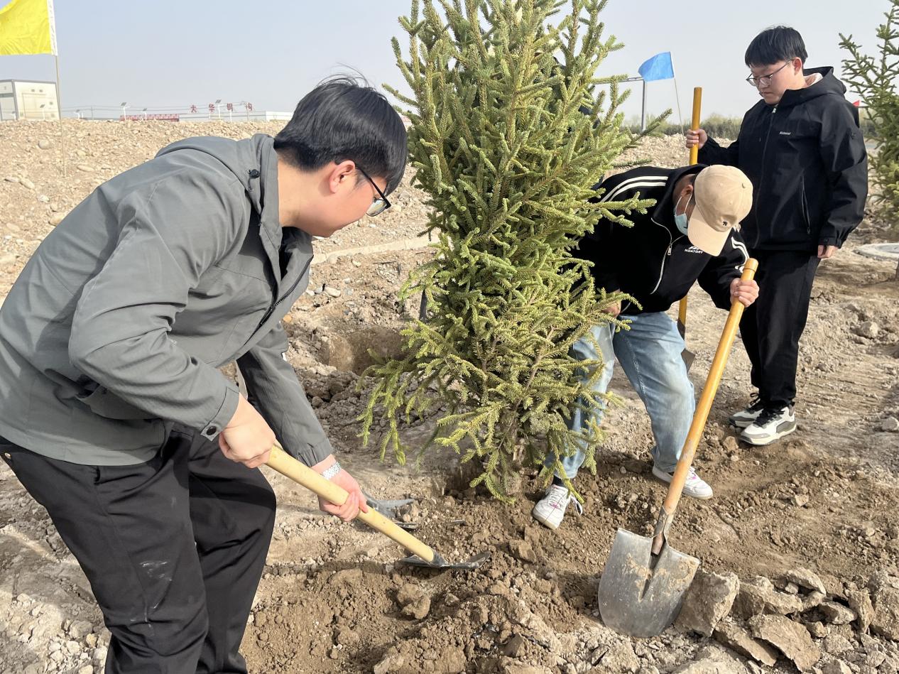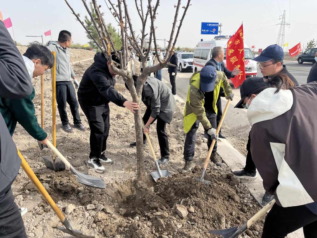 上午10时许,人社志愿服务队准时抵达植树现场,干部职工两三人一组迅速投入劳动,挥锹铲土、扶苗培土等工序有条不紊,现场呈现一派热火朝天的景象。经过两个小时的奋战,共栽植白皮松、海棠等优质树苗70余株,新栽树苗迎风挺立,为春日的戈壁增添勃勃生机。