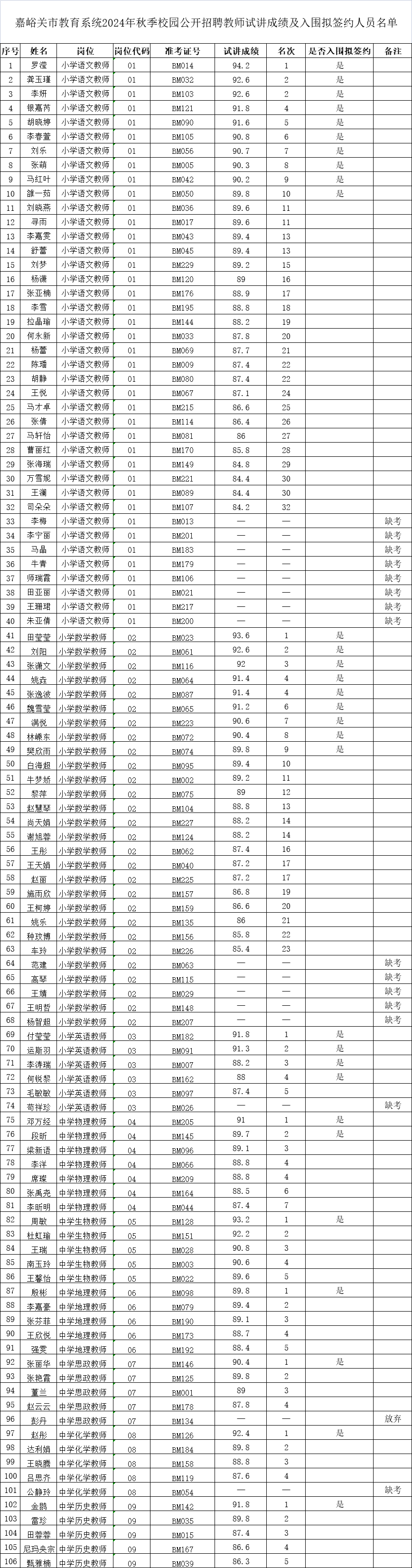 根据《嘉峪关市教育系统2024年秋季校园公开招聘教师公告》相关要求,试讲工作已结束,现将试讲成绩、入围拟签约人员名单及有关事宜通知如下: