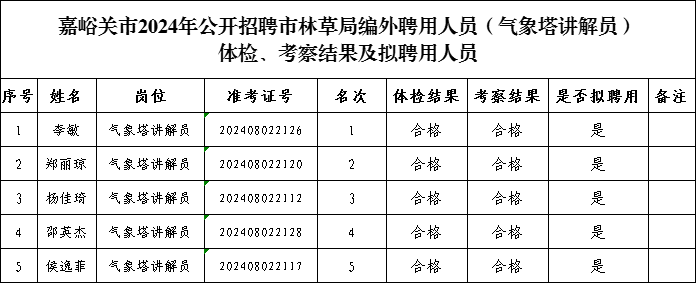 一、嘉峪关市2024年公开招聘市林草局编外聘用人员(气象塔讲解员)体检、考察结果及拟聘用人员名单(详见附件)