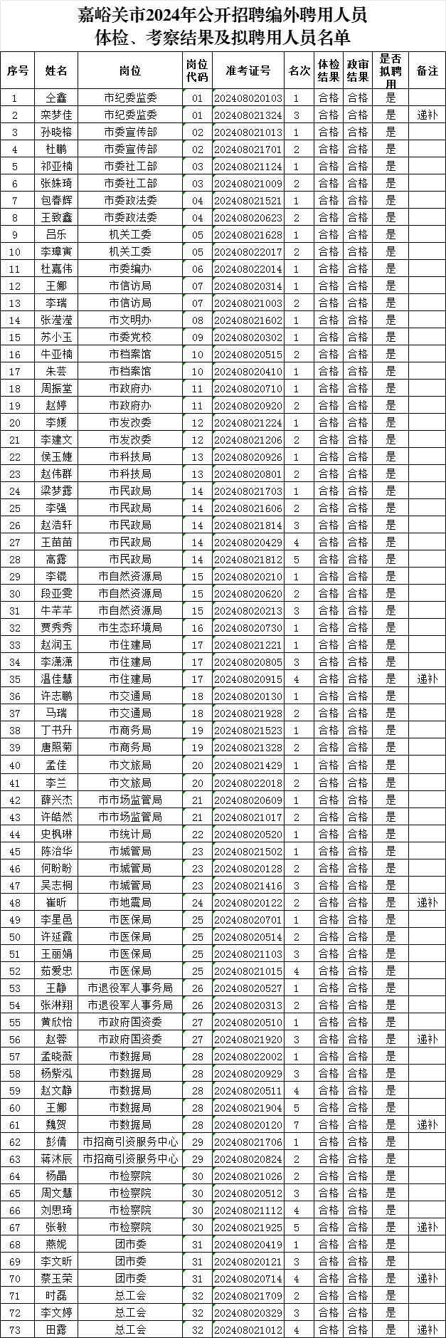 附件:嘉峪关市2024年公开招聘编外聘用人员体检、考察结果及拟聘用人员名单
