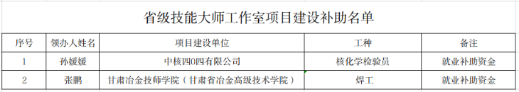 嘉峪关市人力资源和社会保障局关于拨付孙媛媛、张鹏技能大师工作室项目建设补助资金的公示