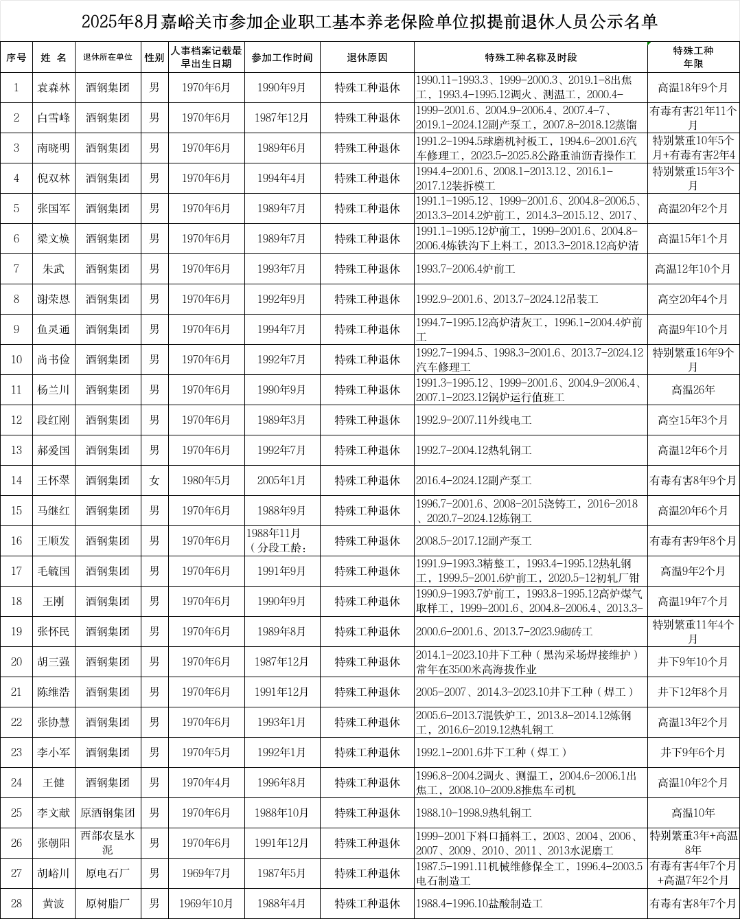 关于2025年8月参加企业职工基本养老保险单位拟提前退休人员的公示
