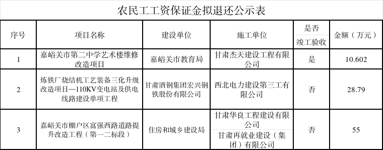 根据《嘉峪关市贯彻落实<甘肃省工程建设领域农民工工资保证金管理办法>实施意见》相关规定,现对以下工程项目(见附件)申请退还农民工工资保证金情况进行公示,如发现存在拖欠农民工工资行为,请及时携带有关证据材料前往嘉峪关市人力资源和社会保障局劳动保障监察科投诉举报。如不存在工资拖欠问题,我局将按规定程序退还农民工工资保证金。