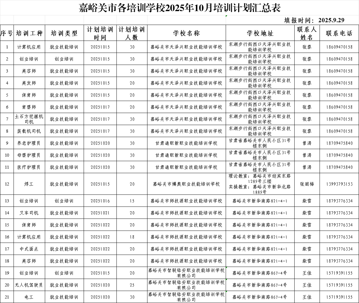 附件:嘉峪关市各培训学校2025年10月培训计划汇总表