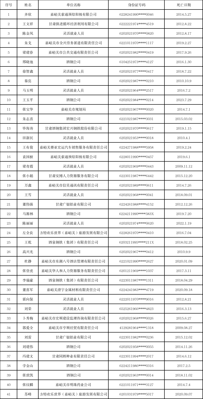 为进一步规范企业职工基本养老保险个人账户管理,切实保障参保人员合法权益,根据《中华人民共和国社会保险法》及相关政策规定,现就齐欣等41名已死亡人员企业职工基本养老保险长期沉淀个人账户资金清退事项公告如下:
