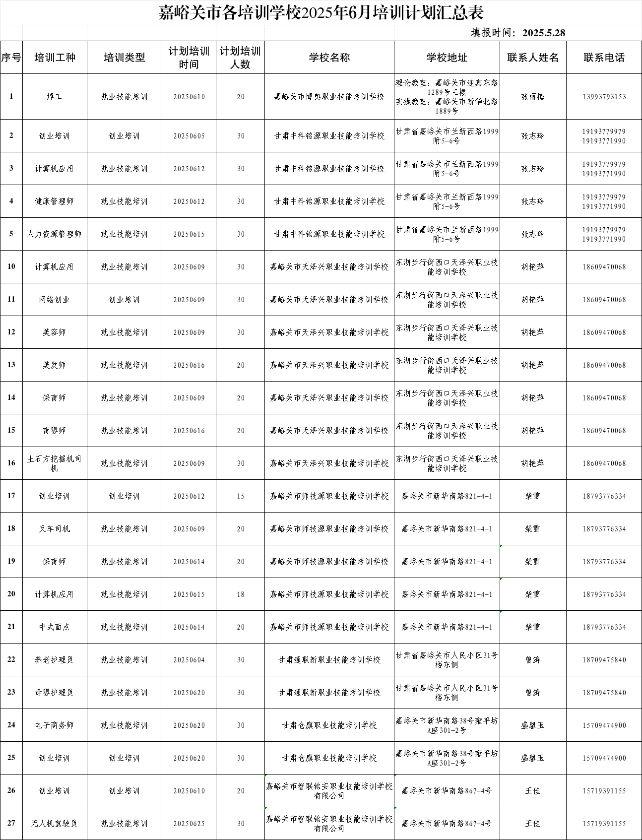 嘉峪关市各培训学校2025年6月培训计划汇总表
