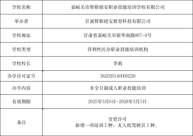 关于准予嘉峪关市智联铭安职业技能培训学校有限公司变更《民办学校办学许可证》的公示