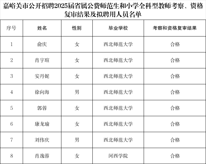 嘉峪关市公开招聘2025届省属公费师范生和小学全科型教师考察、资格复审结果及拟聘用人员公示