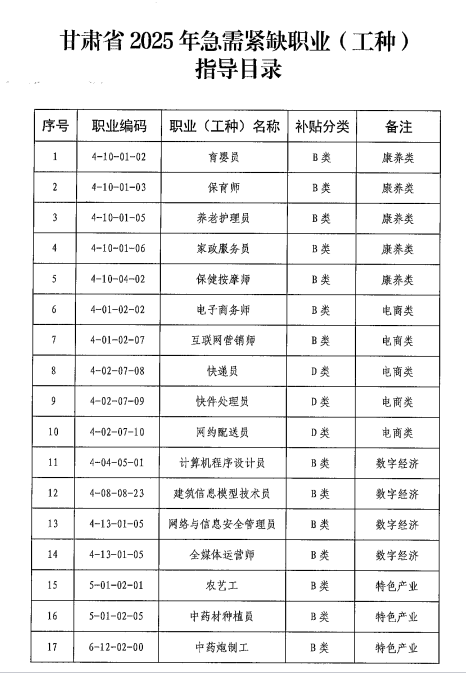 附件:2025年甘肃省急需紧缺职业(工种)指导目录