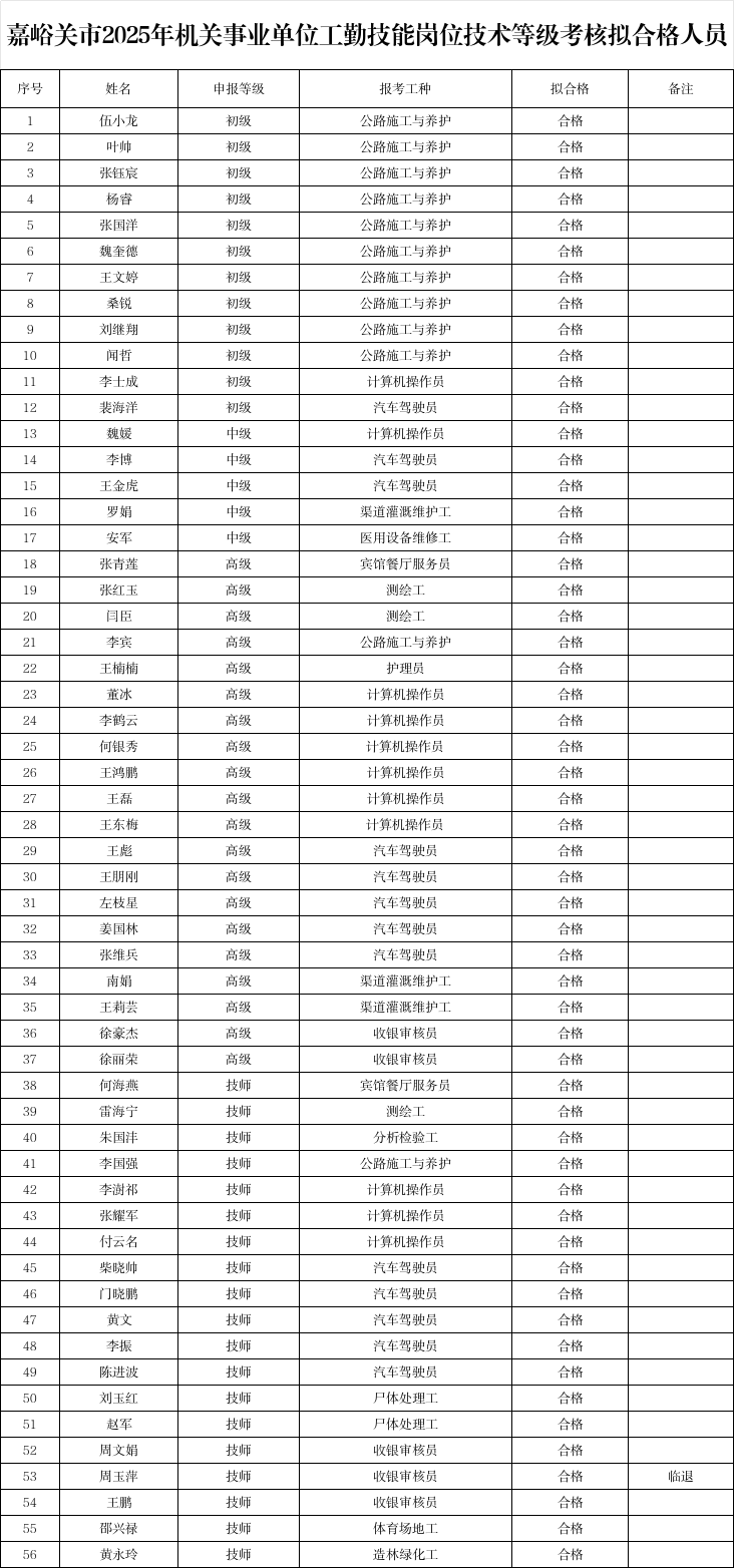 关于嘉峪关市2025年机关事业单位工勤技能岗位技术等级考核拟合格人员的公示