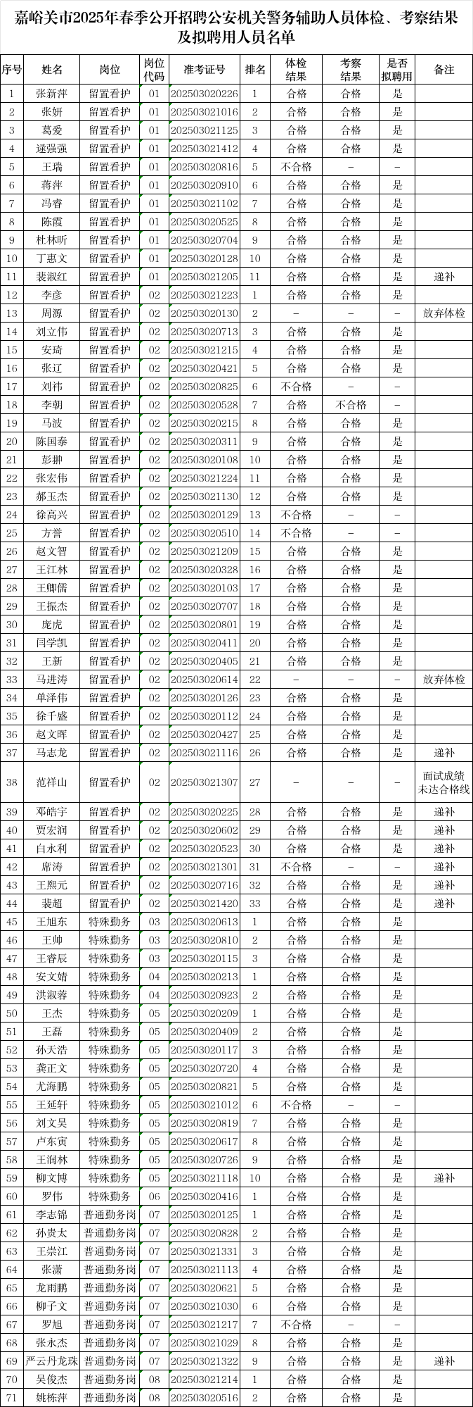 嘉峪关市2025年春季公开招聘公安机关警务辅助人员体检、考察结果及拟聘用人员公示