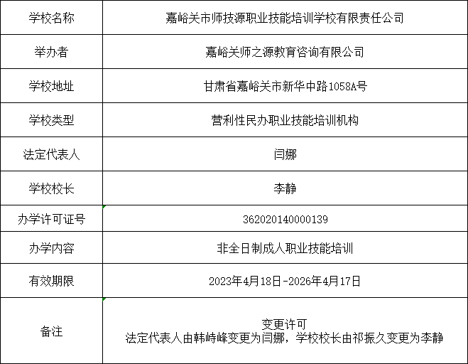 嘉峪关市师技源职业技能培训学校有限责任公司向我局提交变更《民办学校办学许可证》等申报材料,根据《中华人民共和国民办教育促进法》《民办教育促进法实施条例》的规定和要求,按照公平、公正、公开的原则,通过审查评估,嘉峪关市师技源职业技能培训学校有限责任公司符合变更的相关规定和要求,准予变更。现就相关情况予以公示。