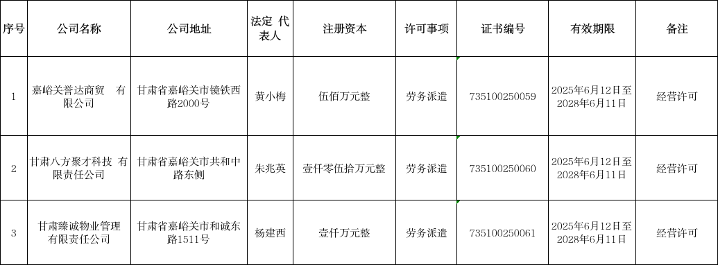 关于嘉峪关誉达商贸有限公司等3家公司劳务派遣经营许可的公示