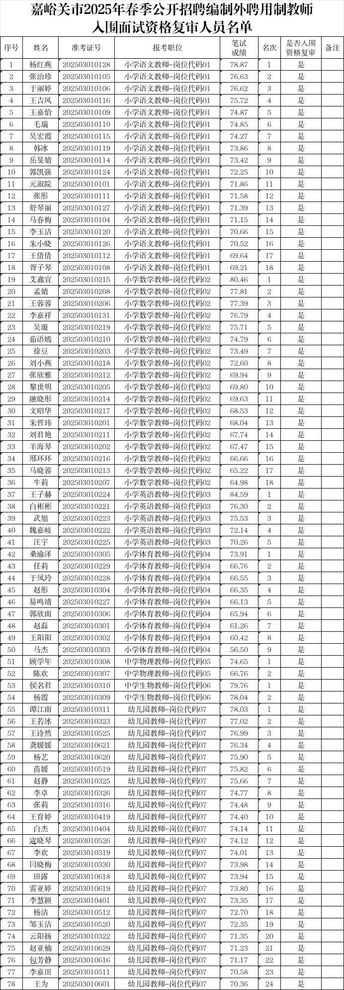 嘉峪关市2025年春季公开招聘编制外聘用制教师入围面试资格复审人员名单(见附件)