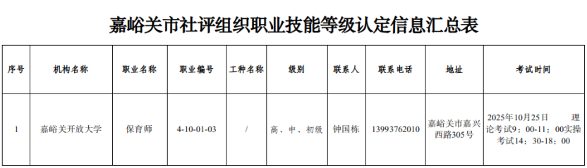 附件:嘉峪关市社评组织职业技能等级认定信息汇总表