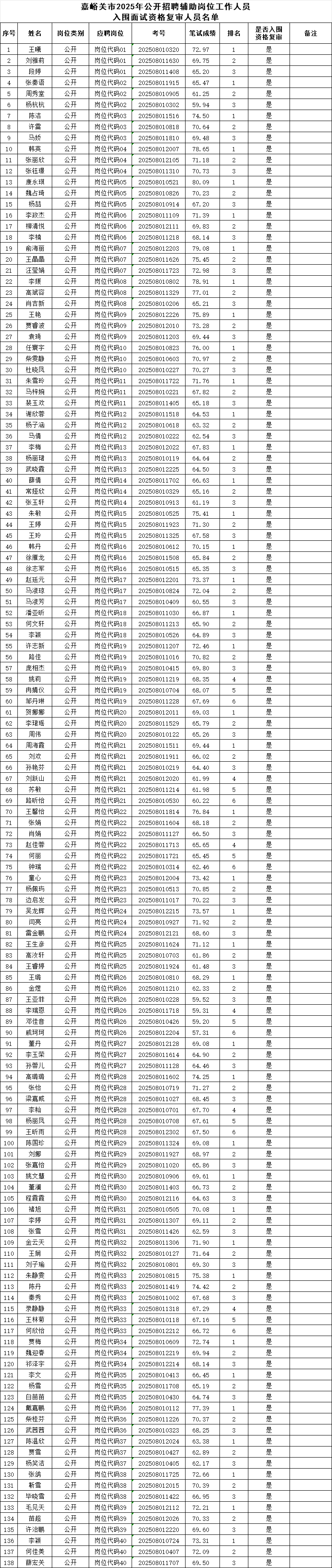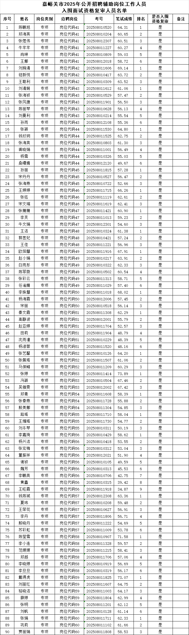 嘉峪关市2025年公开招聘辅助岗位工作人员入围面试资格复审人员名单(见附件)